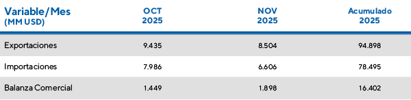 Noviembre volvió a ser un mes muy favorable para el comercio exterior. La balanza comercial registró un superávit de USD 1.898 millones, un 46,2% superior al observado en igual mes del año anterior. Las exportaciones crecieron un 8,2% interanual, mientras que las importaciones mostraron un aumento marginal del 0,6%.