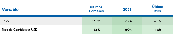 • Mercado accionario: Las acciones chilenas se encaminan a cerrar su mejor desempeño desde 2009, con una suba cercana al 60% en dólares. La tendencia alcista del precio del cobre, la estabilización del mercado del litio y la perspectiva de mayor estabilidad política y jurídica han sido los principales motores del rally bursátil.