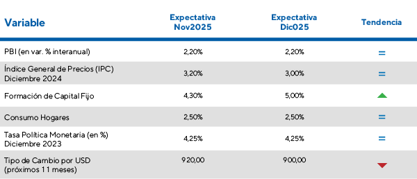• Política monetaria: El banco central continuó reduciendo la tasa de referencia hasta el 4,5% y proyecta que la tasa real converja a niveles de normalidad hacia 2026.