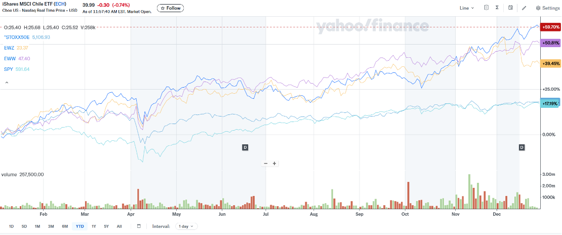 ETFs Ishares MSCI Chile (ECH), Brasil (EWZ), México (EWW), Estados Unidos (Índice S&P 500) y Europa (EuroStoxx 50) en el 2025