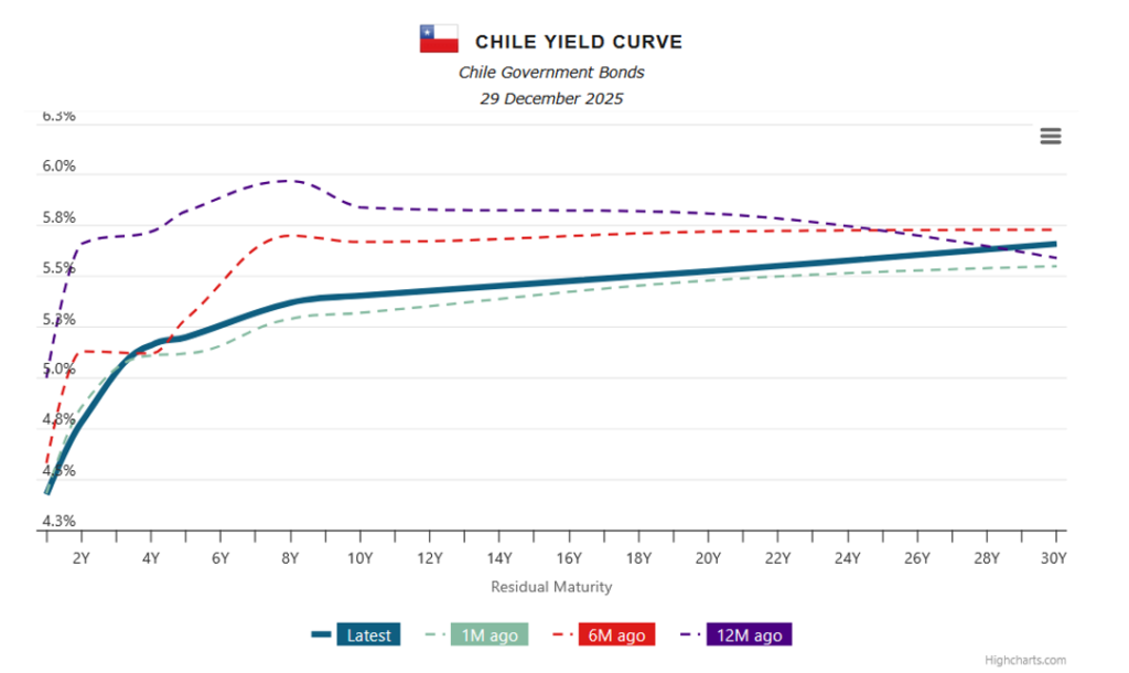 La curva de retornos en pesos chilenos continuó normalizándose en comparación con la observada seis y doce meses atrás. En relación con un mes previo, los rendimientos mostraron leves aumentos a partir del tramo de cuatro años. En conjunto, esta dinámica sugiere que el mercado anticipa una inflación más baja en 2026, aunque exhibe una postura algo menos optimista en los tramos medio y largo de la curva.
